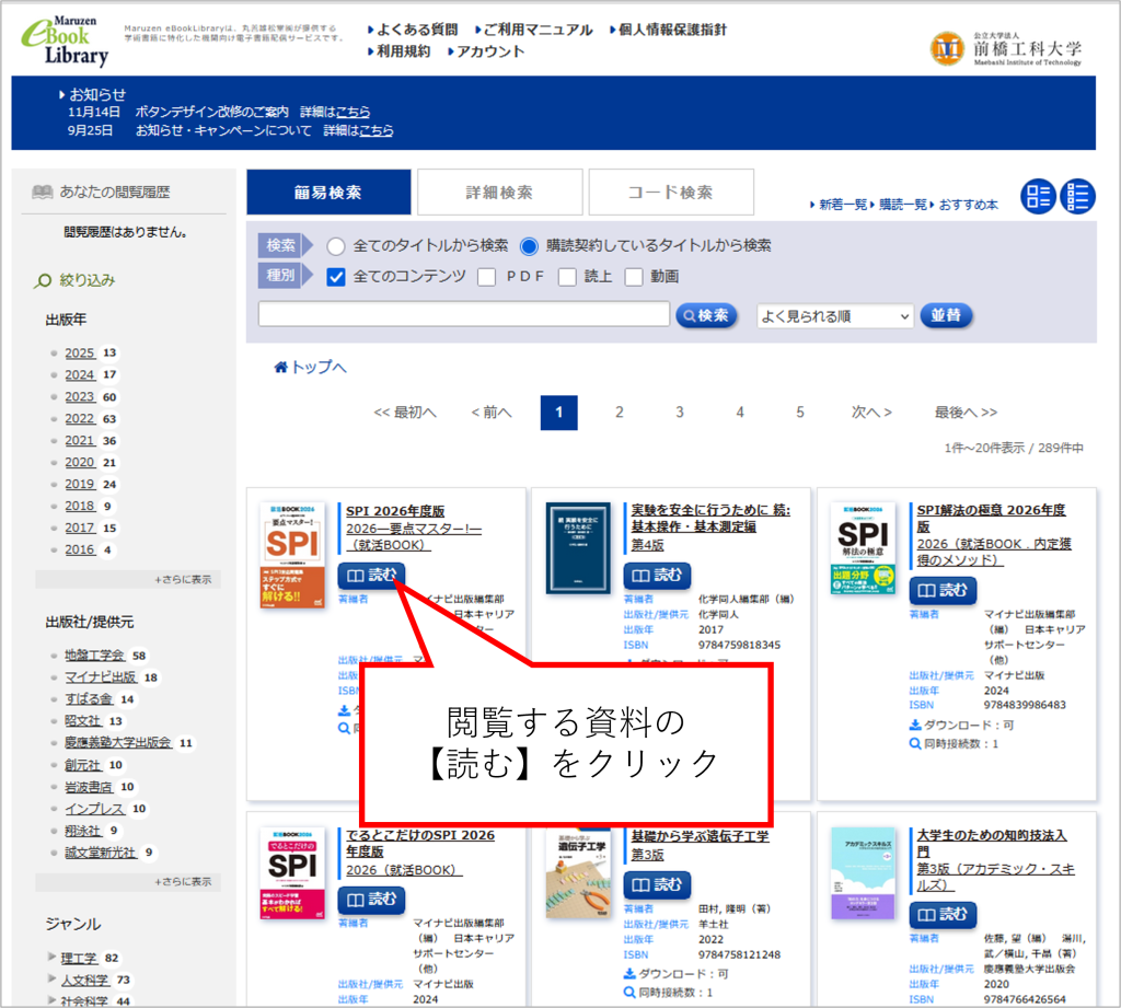 ・ご利用になりたい資料の【読む】をクリックすることで閲覧することができます。